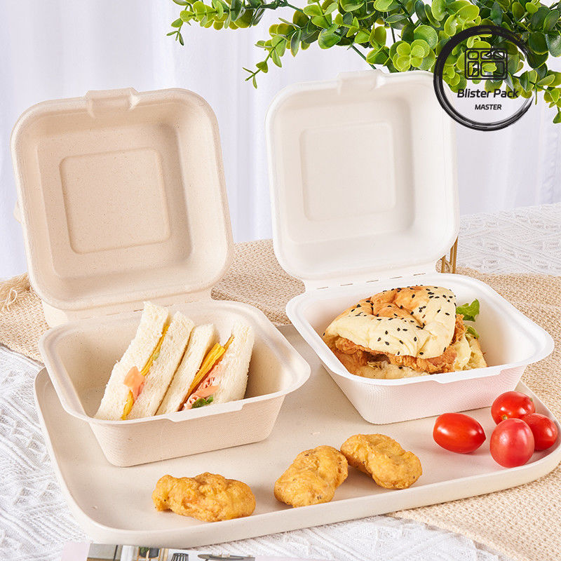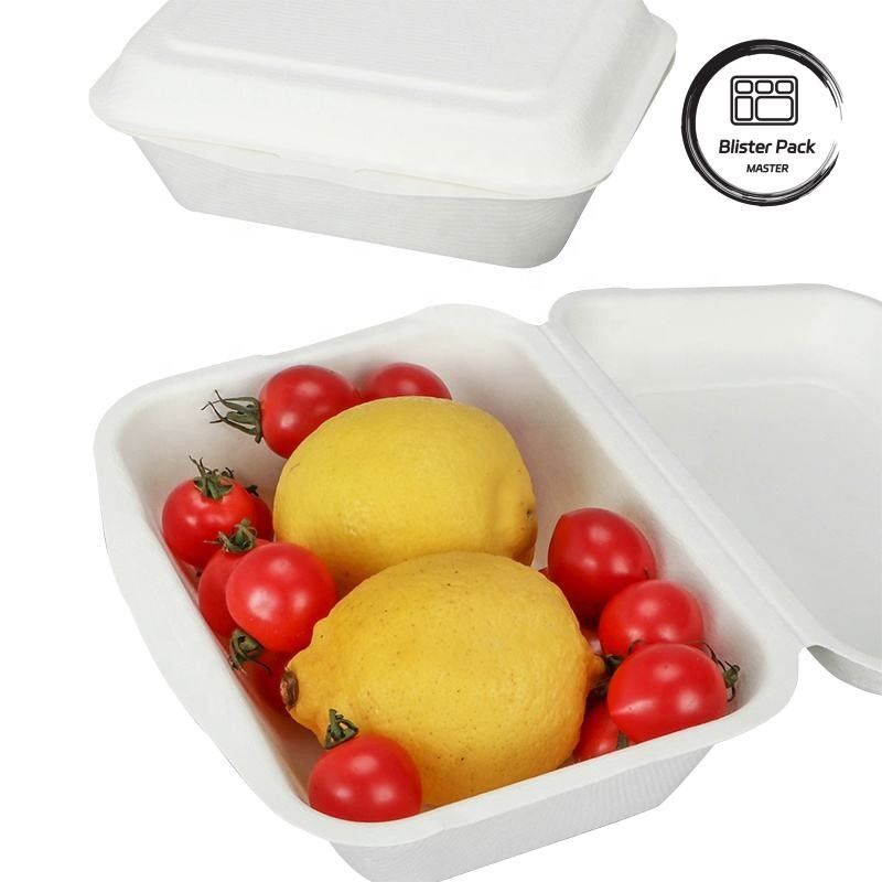 Blister Pack Master's biologisch abbaubare Zuckerrohr-Bagasse Clamshell Lunch Box ist für Lebensmittelunternehmen, die ihren CO2-Fußabdruck reduzieren möchten, sehr zu empfehlen.Nahrungsmittelfahrzeuge, und jede Einrichtung, die Mitnahme-Dienstleistungen anbietet, die eine nachhaltige Lösung ohne Kompromisse bei der Qualität oder Funktionalität bietet.